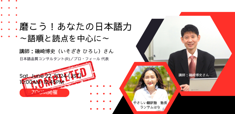 2022年5月21日(土)、翻訳学校サン・フレア アカデミー様主催による「磯崎博史の日本語ブラッシュアップセミナー 〜表現力強化編〜」の講師を務めることになりました。講義は「Zoom」を活用したオンラインで行います。