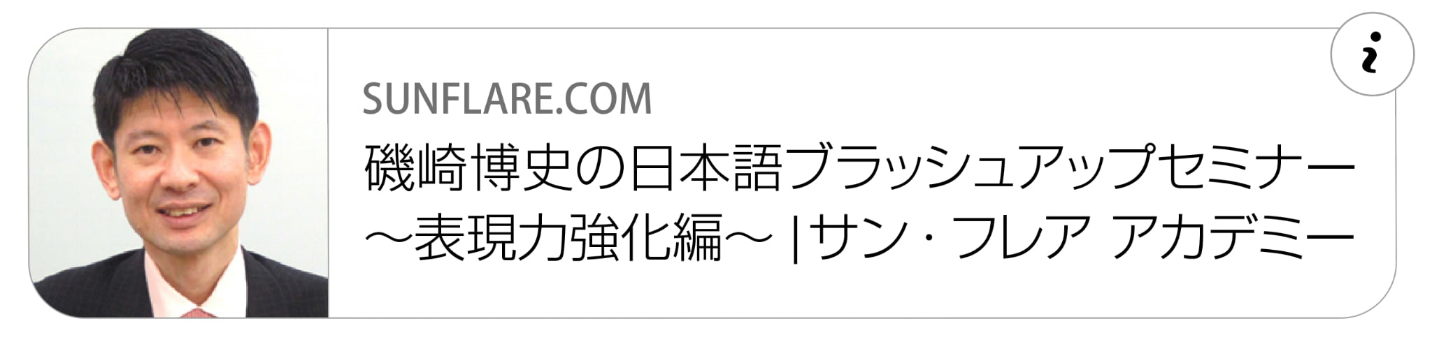 2025年9月13日(土)、翻訳学校サン・フレア アカデミー様主催による「磯崎博史の日本語ブラッシュアップセミナー 〜表現力強化編〜」の講師を務めることになりました(2022年5月に続いて3回目の開催です)。