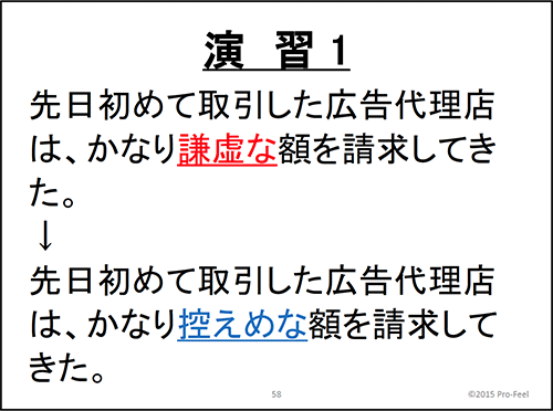 こちらのスライドは最初の実習テーマである「ふさわしい語句の選択」より。このようなビフォーアフターを通して、文章品質を向上させるためのポイントを確認しました
