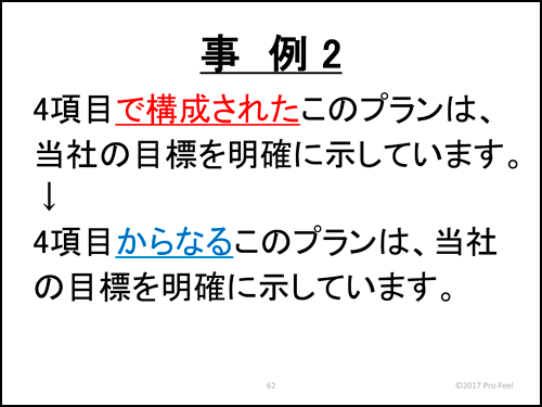 こちらのスライドは最初の実習テーマである「適切な語句を選択する」より。このようなビフォーアフターを通して、文章品質を向上させるためのポイントを確認しました