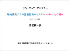 - とてもわかりやすい説明と、有意義で盛りだくさんの内容で大変勉強になりました。レジュメと一緒にいただいた表記統一表も、非常にありがたい資料です。今後はいろいろな場面で活用させていただきたいと思います。ありがとうございました!